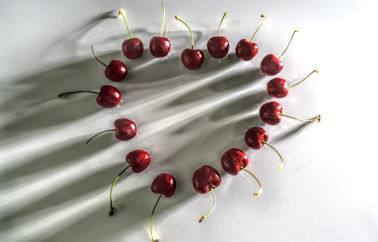 I did some fun stuff with the fresh cherries, too! I made a heart shape with them and kept it simple with a white background. I set the light up so that there would heavy shadows for a little something different. The cherries in ice came out better than expected. I was having trouble creating clear ice. But these came out just clear enough to see the cherries. I love all the little bubbles and details in the blocks, too.